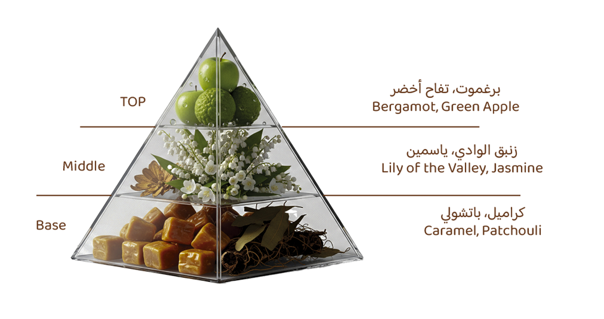 Kahraman, opens with refreshing bergamot and green apple, transitions to a heart of jasmine and valley rose, and settles on a warm base of caramel and patchouli, achieving a perfect balance between softness and warmth.